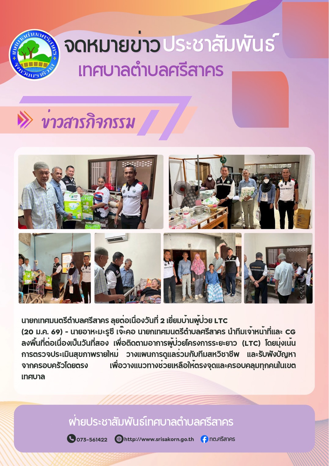 นายกเทศมนตรีตำบลศรีสาคร นำทีมลงพื้นที่เชิงรุกติดตามคุณภาพชีวิตผู้ป่วย LT