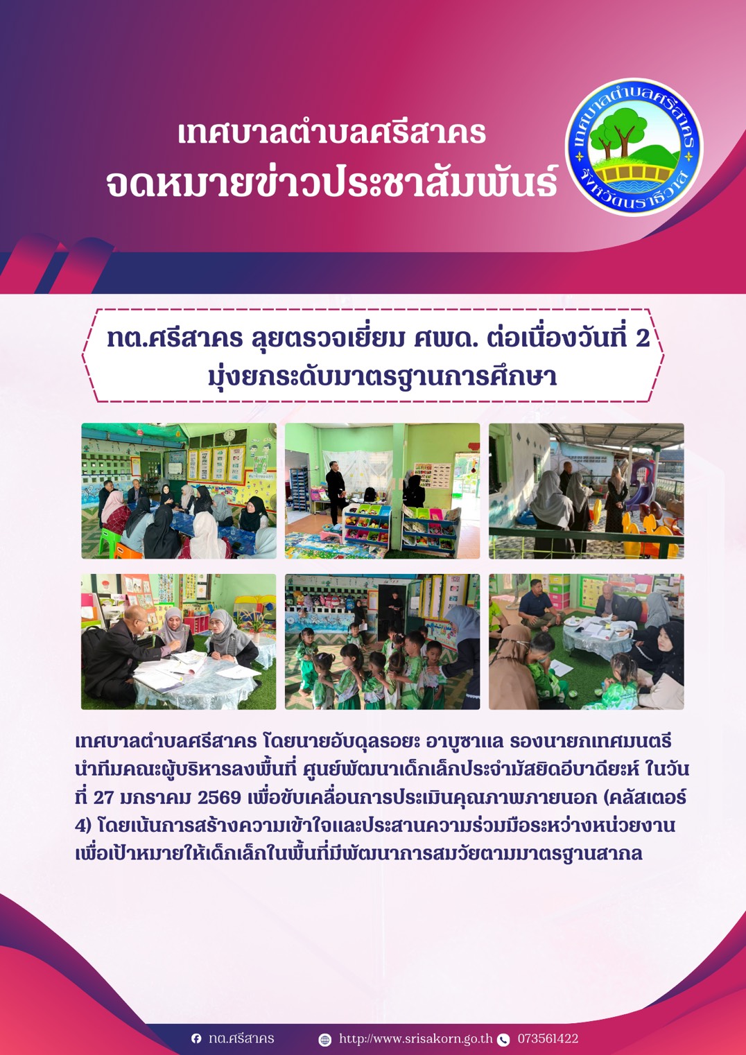 ทต.ศรีสาคร ลุยตรวจเยี่ยม ศพด.ต่อเนื่องวันที่ 2 มุ่งยกระดับมาตรฐานการศึกษา