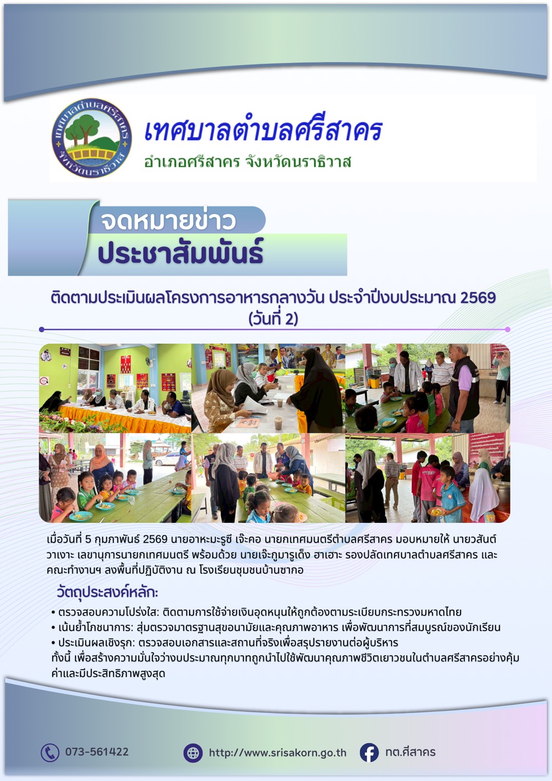 ติดตามประเมินผลโครงการอาหารกลางวัน ประจำปีงบประมาณ 2569(วันที่ 2)